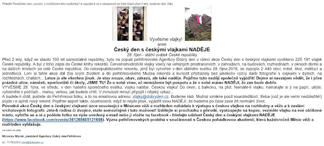 Ve středu byl státní svátek - vždycky, když vidím nadšené Angličany slavící své státní svátky - tak jim závidím, jak si to užívají. U nás je to pro mnohé jen den volna, a nenapomáhají tomu ani média. My jsme se letos připojili k výzvě, která si našla mailem Český den s českými vlajkami naděje!